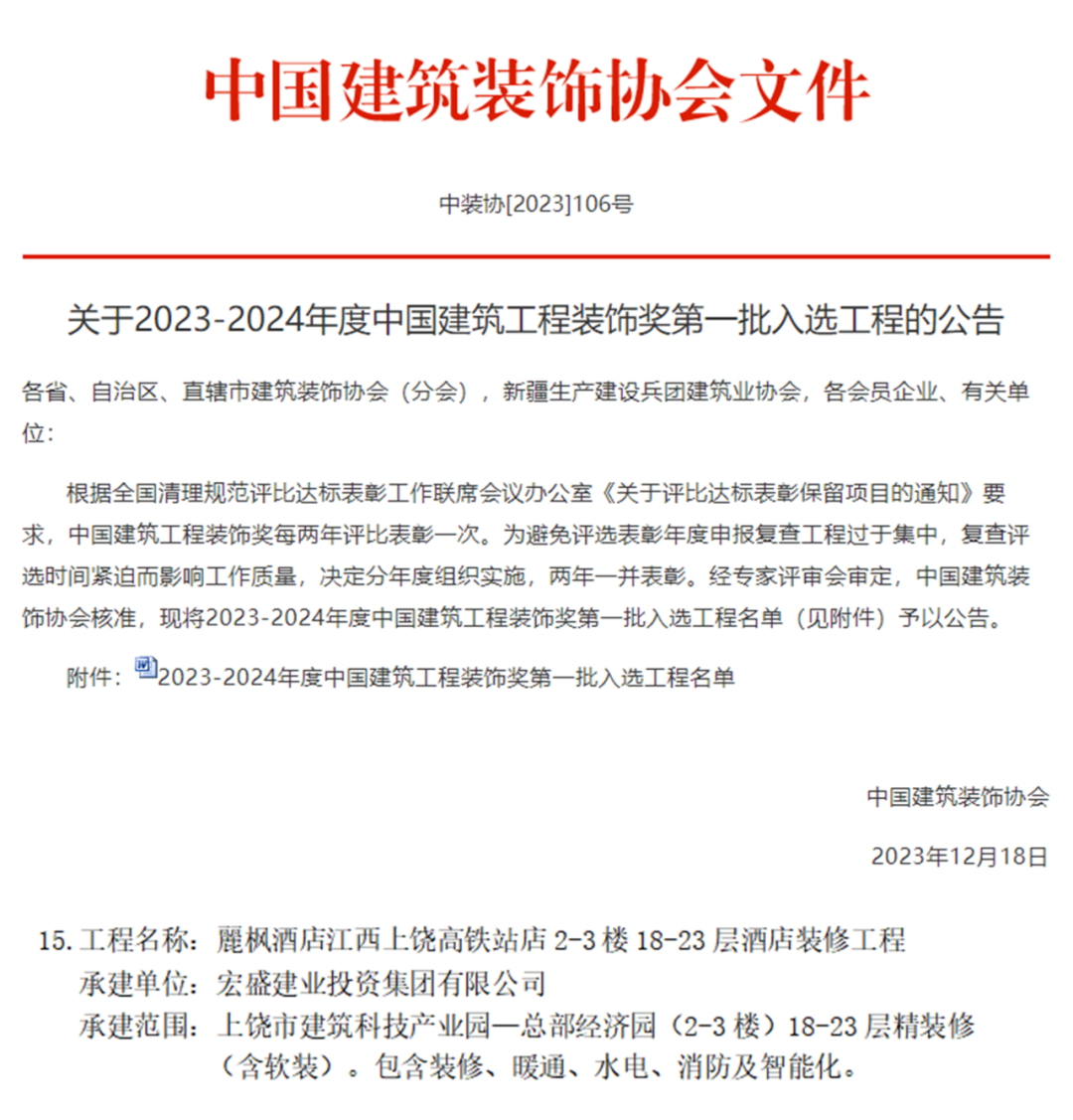 中國建筑工程裝飾獎(jiǎng)是經(jīng)住房和城鄉(xiāng)建設(shè)部批準(zhǔn),由中國建筑裝飾協(xié)會(huì)主辦的評(píng)選活動(dòng),是中國建筑裝飾行業(yè)的最高榮譽(yù)獎(jiǎng),代表了全國建筑裝飾裝修領(lǐng)域內(nèi)工程質(zhì)量最高水平。經(jīng)評(píng)審委員會(huì)嚴(yán)格評(píng)定,宏盛建業(yè)集團(tuán)承建項(xiàng)目——麗楓酒店江西上饒高鐵站店2-3樓18-23層酒店裝修工程脫穎而出榮獲中國建筑工程裝飾獎(jiǎng)。