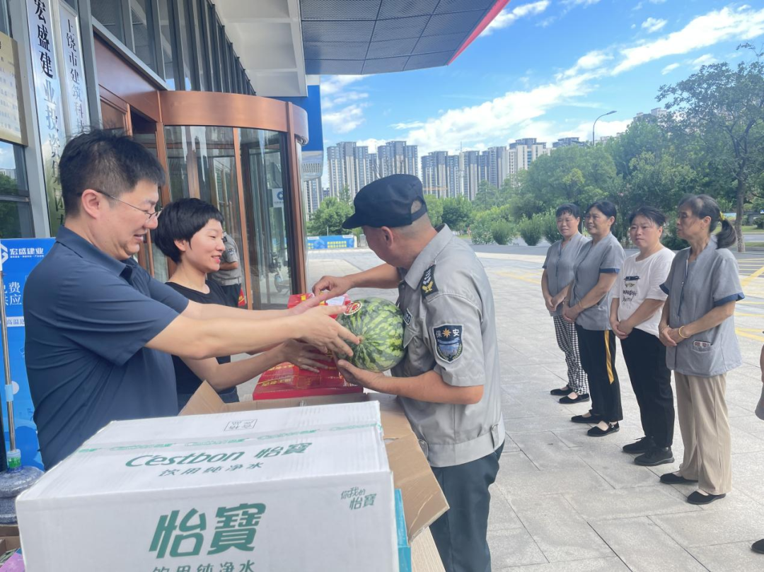夏日炎炎,保安保潔等工作人員是產(chǎn)業(yè)園安全和環(huán)境的守護(hù)者。7月26日,上饒市建筑科技產(chǎn)業(yè)園黨支部精心策劃,為這些一線戰(zhàn)高溫的工作人員遞溫暖、送清涼。