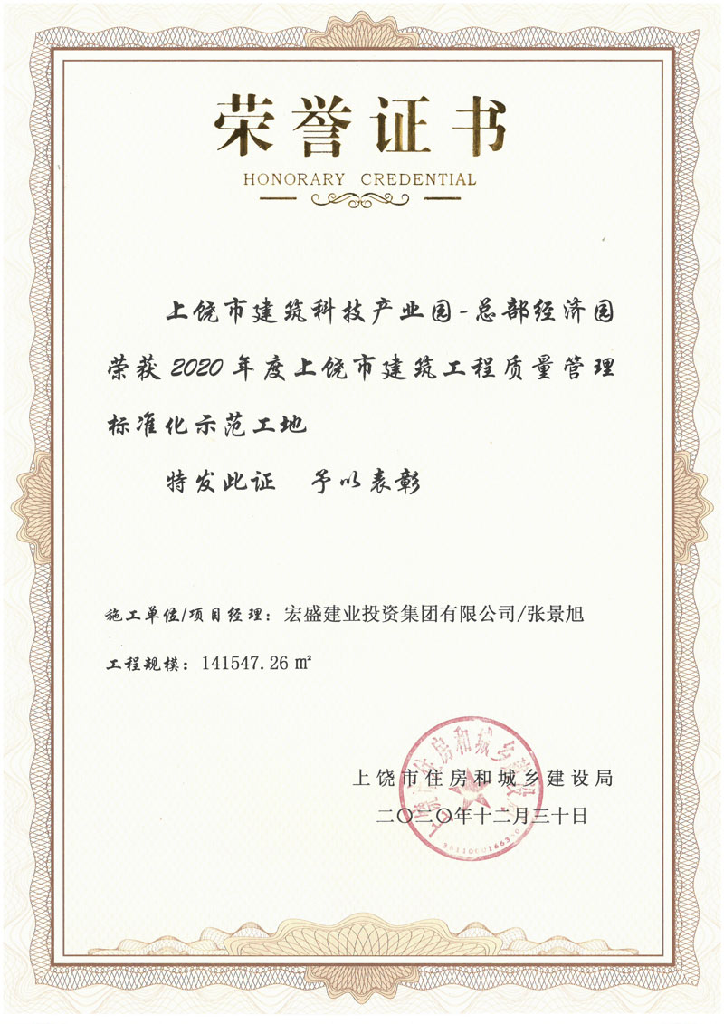 上饒市建筑科技產(chǎn)業(yè)園-總部經(jīng)濟(jì)園項(xiàng)目榮獲“2020年度上饒市建筑工程質(zhì)量管理標(biāo)準(zhǔn)化示范工地”。