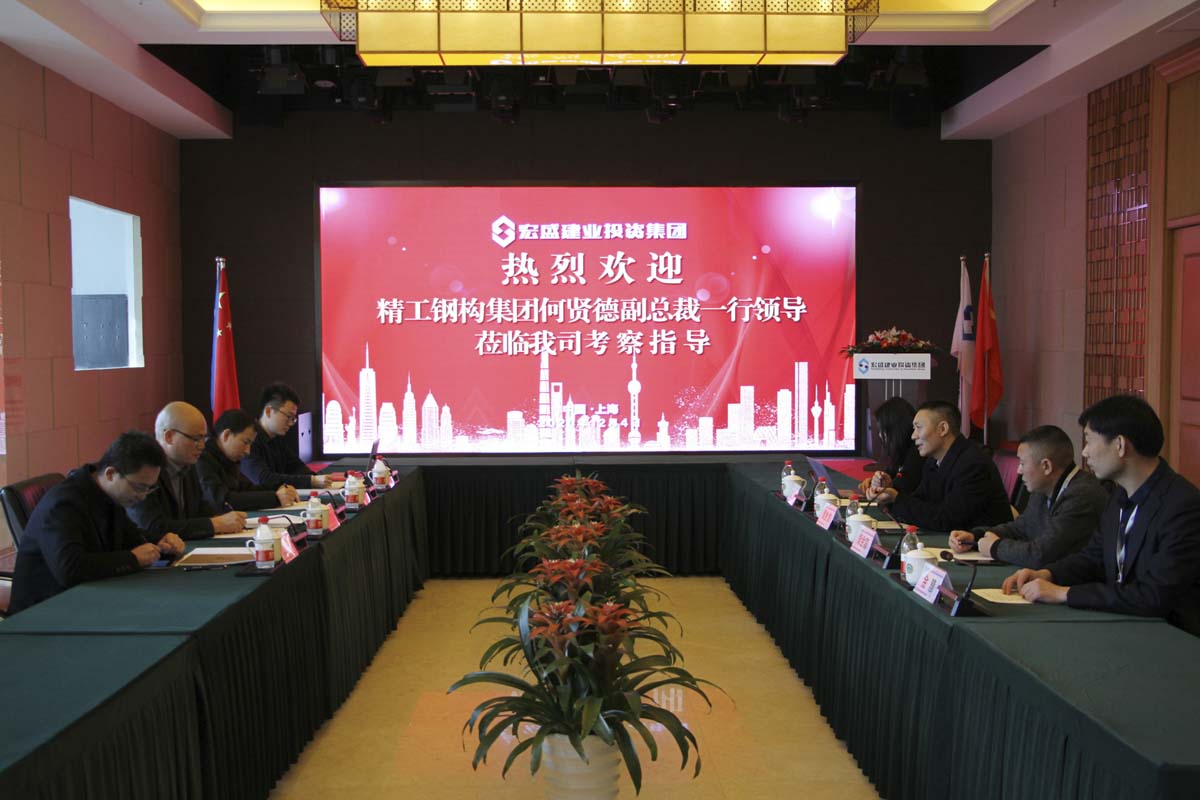 12月4日,長江精工鋼構(gòu)集團(tuán)副總裁何賢德一行到宏盛建業(yè)上??偛靠疾旖涣?,集團(tuán)董事長周金虎陪同座談。雙方就攜手助推裝配式產(chǎn)業(yè)發(fā)展達(dá)成合作意向,共商未來發(fā)展布局規(guī)劃。