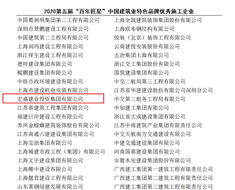 宏盛建業(yè)獲評(píng)2020年度百年匠星中國(guó)建筑業(yè)“優(yōu)秀施工企業(yè)”稱號(hào)