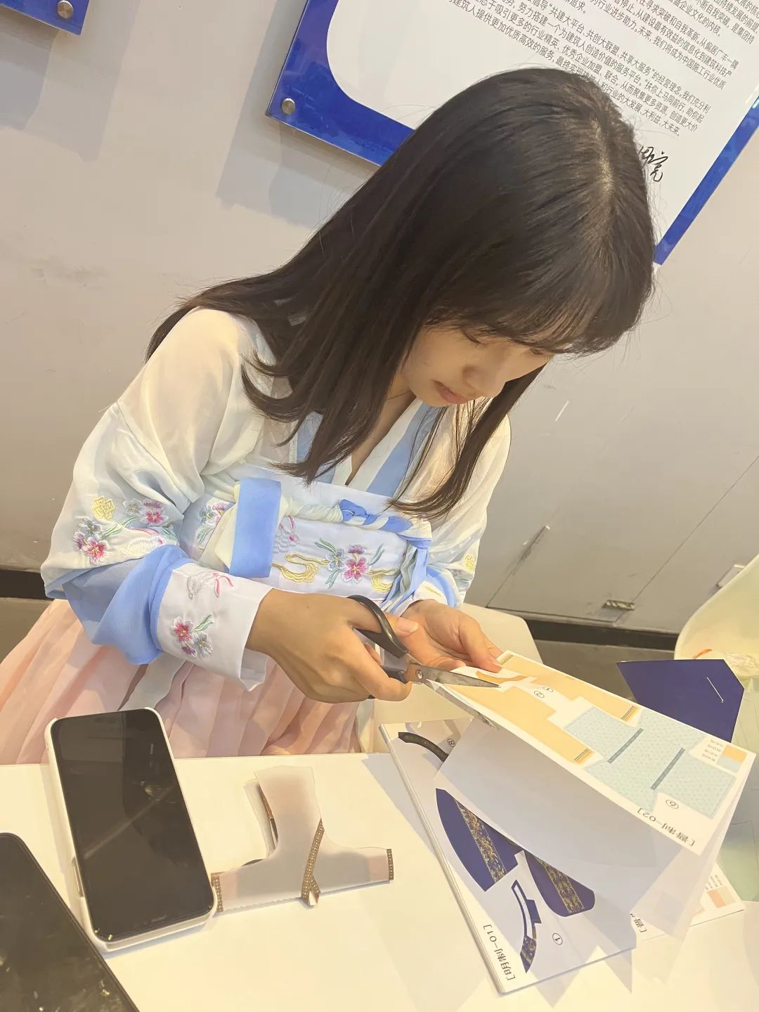 心靈手巧的同事們,照著圖紙,拿起手中已經(jīng)被剪好的圖案進(jìn)行拼接,通過家人們的手,一件件小巧精致的漢服被展現(xiàn)在我們的眼前。