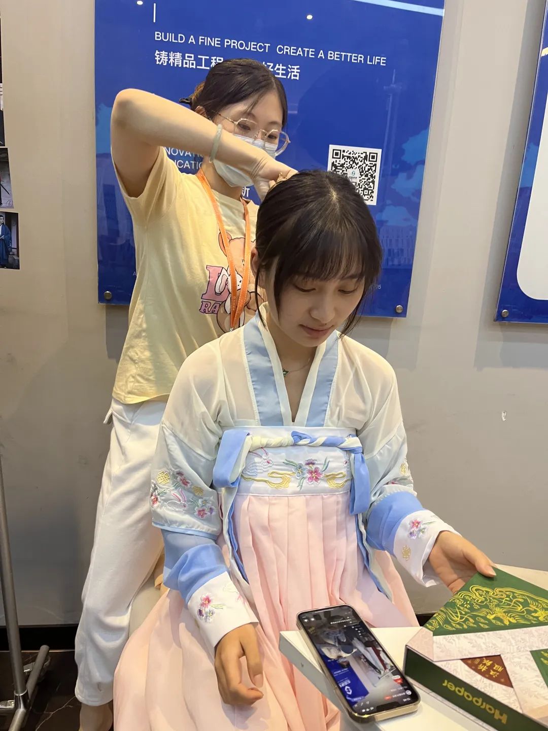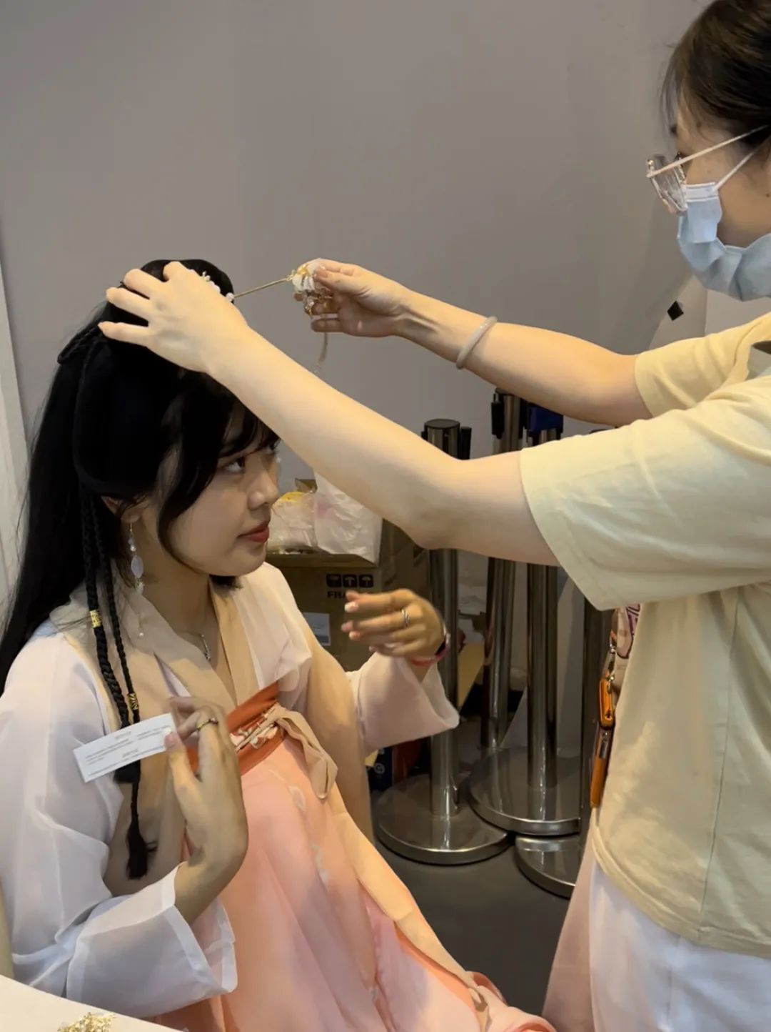 化妝師為已經(jīng)穿戴好漢服的同事整理發(fā)型、裝扮頭飾,攝影師們不斷指導(dǎo)拍攝動作、調(diào)整姿態(tài),一張張屬于宏盛家人們自己的漢服照完美呈現(xiàn)出來。大家都說:“拍的真好,不但美,連古代的那種意境也都體現(xiàn)地淋漓盡致,非常期待成品!”